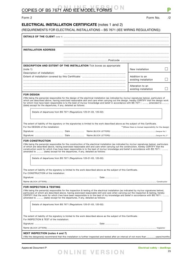 You will then receive an Electrical Installation Certificate (EIC) or Minor Electrical Installation Works Certificate (MEIWC) from your have to comply with Part P of the Building Regulations whereas in ... Access Document